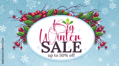 sale, winter, banner, discount, berry, leaf, snowflake, promotion, seasonal, holiday, shopping, offer, marketing, frosty, cold, blue, background, illustration, festive, announcement, retail, commerce, advertisement, bright, red, green, snow, icy, decorative, frost, clearance, big, event, template, graphic, card, message, percent, promo, fair, christmas, december