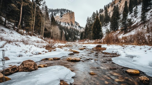 stream, river, water, snow, ice, winter, mountain, vale, rock, stone, tree, pine, conifer, forest, cold, glacé, landscape, nature, scenery, wilderness, tranquil, serene, peaceful, quiet, calm, flowing, current, bank, snowy, frigid, stillness, solitude, picturesque, majestic, breathtaking, beautiful, rugged