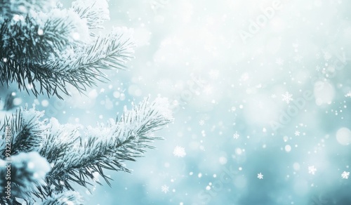 Winter Wonderland Background with Snow Covered Pine Branch and Falling Snowflakes