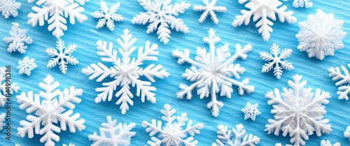 Winter wonderland, intricate paper snowflakes, layered 3D effect, crisp white on sky blue background, delicate shadows, geometric patterns, festive holiday atmosphere, macro photography, clean and min