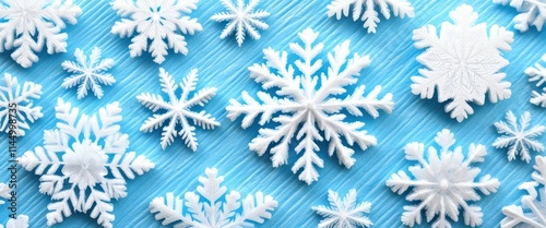 Winter wonderland, intricate paper snowflakes, layered 3D effect, crisp white on sky blue background, delicate shadows, geometric patterns, festive holiday atmosphere, macro photography, clean and min