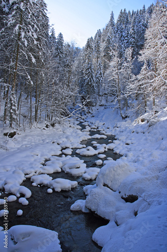 stream, snowy, winter landscape, snow, winter, wintery, cold, cool, season, countryside, panorama, forest, tree, conifer, glacé, ease, calm, untouched, peaceful, recreation, nature, shadow