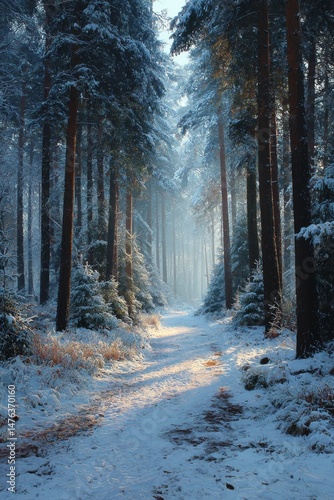Winter's Embrace: Snowy Path Through a Tranquil Forest Bathed in Soft Sunlight, a Serene Winter Wonderland Scene