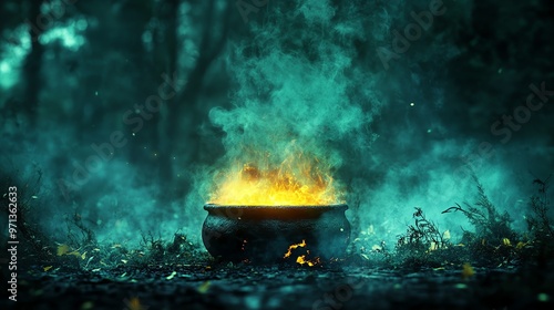Witchs cauldron bubbling over a fire, eerie green smoke rising, dark forest background, Halloween magic