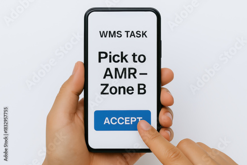 WMS task on smartphone screen with hand accepting pick to AMR zone B for supply chain logistic management and efficient operation