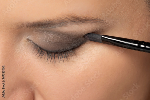 woman applying ceyeshadow with a brush.