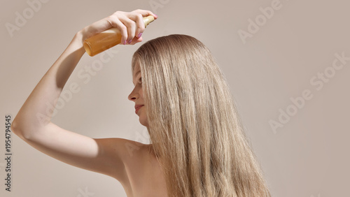 Woman applying spray product to long straight hair in minimal studio environment. Concept of hair protection, styling routine, cosmetic care and daily beauty maintenance.