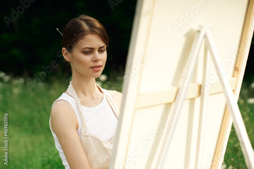 woman artist in aprons in nature draws a picture art