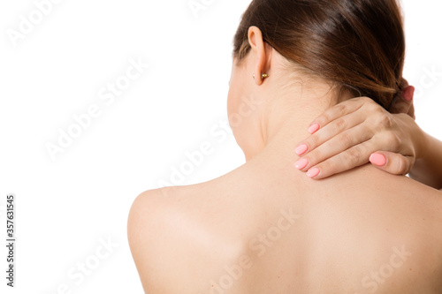 sick, beautiful, only, massage, pain, background, man, woman, hair, close, 1, sleepy, medicine, people, hand, isolated, back, head, arm, disease, medicals, young, caucasian, health care, white, muscle, female, painful, physical, shoulder, touching, health, spine, adult, rubbing, stress, woman, body, girl, neck, trauma, cramp, red