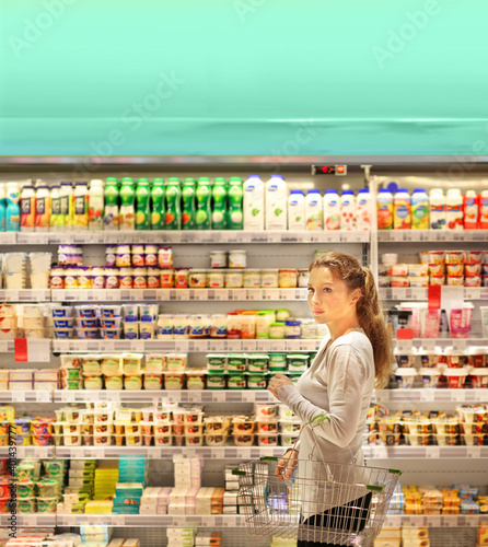 Woman choosing a dairy products at supermarket.