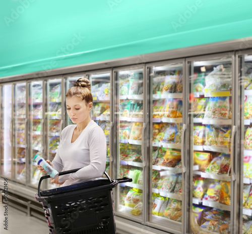 Woman choosing frozen food from a supermarket freezer.