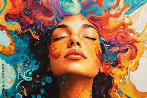 Woman collage art for mental health, meditation, and peaceful design. Vibrant pop art representation for creative marketing or social awareness campaigns, Generative AI