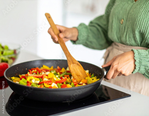 woman, cooking, stir, fries, vegetable, pepper, bell, pepper, red, yellow, green, kitchen, modern, healthy, food, meal, prepare, delicious, tasty, home, lifestyle, indoor, closeup, hand, wooden, spoon, pan, black, induction, cooktop, clean, bright, vibrant, colours, colourful, fresh, ingredient, diet, nourishment, culinary, receipe, process, domestic, life, style, eating, wellness, well-being, happiness