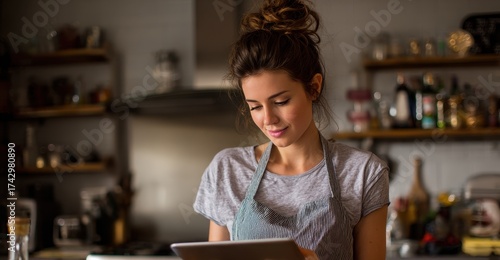 Woman cooking in her kitchen with a tablet