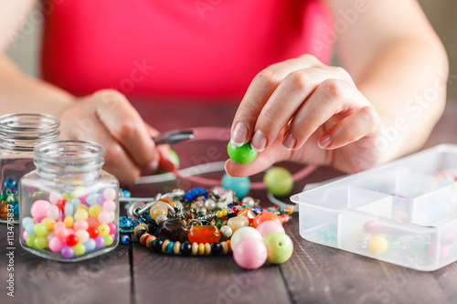 Woman designing colorful necklace with plactic beads