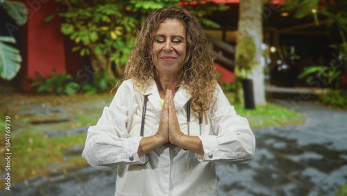 Woman doctor in white coat with stethoscope, hands pressed together prayer gesture and slight smile in clinic courtyard near plants and building entrance; calm compassion.