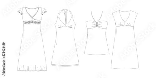 Woman dresses, shirts and tunics technical drawing, template, sketch, flat, mock up. Jersey or woven fabric dress front view, white color