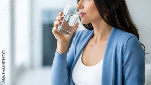 woman, drinking, water, glasses, blue, cardigan, white, tank top, long, brown, hair, indoor, bright, room, healthy, hydratation, refreshment, thirsty, relaxed, calm, serene, everyday, life, people, person, female, drink, beverage, clear, closeup, profile, half face, blurry, background, window, light, daytime, wellness, normal, routine