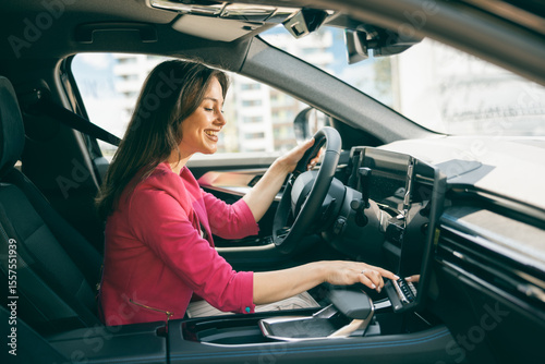 woman, driving, car, modern, urban, smiling, vehicle, city, street, drive, automobile, seat, cheerful, freedom, lifestyle, daylight, landscape, positive, independent, professional, enjoying, joy, safety, vibe, life events, new, comfortable, city landscape, horizontal