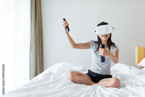 virtual, reality, device, entertainment, technology, headset, life events, digital, video, goggles, looking, ar, goggles, computer, watching, motion picture, reading, woman, girl, female, people, japanese, korean, chinese, asia, asian, home, house, apartment, indoor, inside, bed, bedchamber, living, room, young, couch, sofa, smile, excite, early, morning, afternoon, touching, playing, game, joystick, console