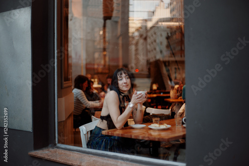 cafes, hot drink, cosy, drink, enjoying, fashion, indoor, leisure, lifestyle, pastry, portrait, relaxation, eatery, shop, sitting, smartphone, table, urban, window, woman