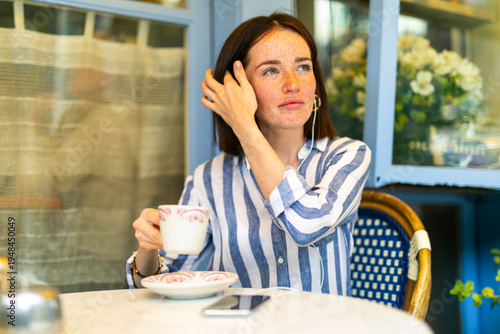 coffee cup, photograph, beautiful, daylight, freckle, relaxing, flower, seating, striped, casual attire, hot drink, drink, moment, people, image, phone, photo, shirt, table, woman, young, blue, cafes, calm, cup