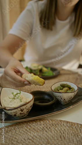 woman, eatery, indoor, mediterranean, food, dining, casual attire, meal, plate, bread, hand, olive, bowl, snack, serving, dish, lunch, table, sauce, dip, vegetable, dinner, tableware, cookery, scene, epicure, white, texture, taste, topping, menu, homemade, culture, hospitality, fresh, delicious, tasting, leisure, lifestyle, fork, favor, relax, crockery, healthy, simple, rustic
