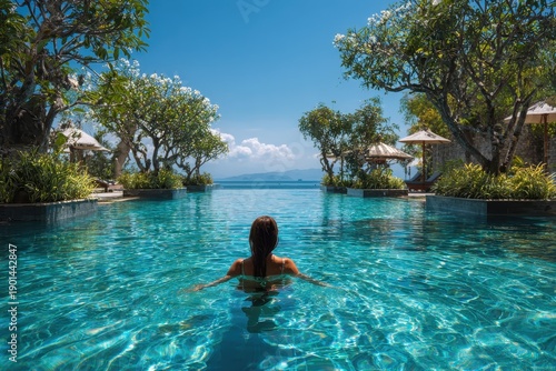 Woman enjoying tranquil relaxation in a pool at a luxury spa amidst lush landscapes in Bali during a sunlit day