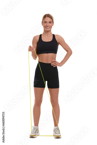 Woman exercising with elastic resistance band on white background