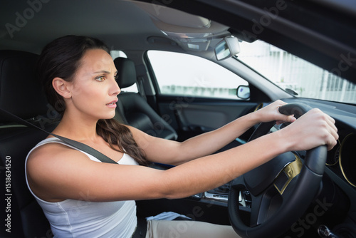 people, seatbelt, steering wheel, dashboard, driving, woman, focused, car, vehicle, safety, modern, travel, transportation, technology, lifestyle, adult, female, european, leather, cabin, interior, hand, gripping, natural light, headrest, white top, parked, building, control, expression, casual attire, single person, young adult, daytime, concentration, automotive