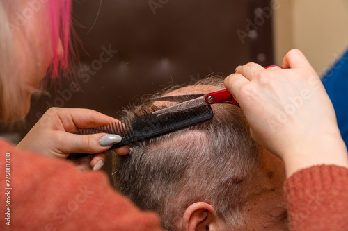 Woman hairdresser cuts a man with a receding hairline with scissors. Selective focus