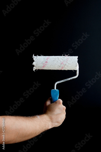 roller, paint, hand, black, background, holding, painter, wall, colours, design, home, paintbrush, house, decorating, tool, work, concept, men at work, interior, equipment, person, improvement, repair, handle, brush, human, occupation, art, decoration, rolled, construction, renovation, space, people, platen, professional, symbol, new, closeup, arm, woman, abstract, brushing, creativity, female, idea, painting, room, male