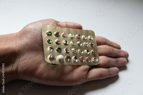 Woman hand holding not a empty contraceptive pack but with only one pill in, with background with with space around.