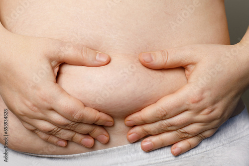 Woman hands on belly pressed skin to show sagging skin after diet and stretch mark after pregnancy closeup