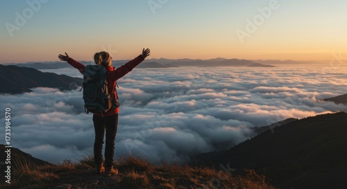woman, hiker, mountain, cloud, sunrise, nature, adventure, freedom, travel, caucasian, backpack, peak, happy, view, high, destination, horizon, sky, calm, achievement, scenic, arm, sport, hobby, serene, peaceful, well-being, leisure, land, wild, majestic, trip, wanderlust, triumph, tranquil, dawn, explorer, explore, success, natural, inspire, raised, escape, healthy, recreation, active, enjoying, sun