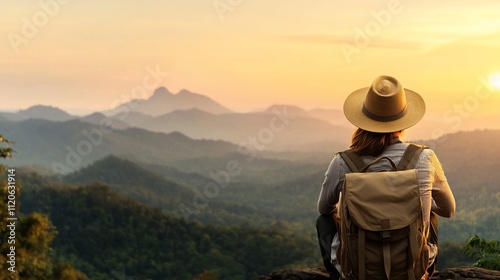 sunset, mountain, landscape, nature, travel, adventure, woman, hiker, backpack, view, scenery, horizon, sky, hill, peak, rock, outdoors, explore, journey, freedom, summer, vacation, relax, calm, peace, serenity, beautiful, scenic, gold, light, silhouette, solitude, discovery, wild, destination, path, way, top, height, vista, range