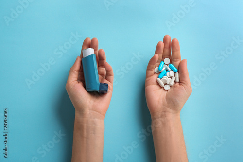 Woman holding asthma inhaler and pills on color background, top view