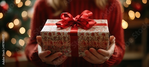 Woman Holding Beautifully Wrapped Holiday Present with Blurred Christmas Lights and Bokeh Background