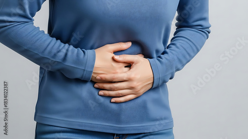 Woman holding her stomach due to stomach ache, pain, or discomfort in the abdomen