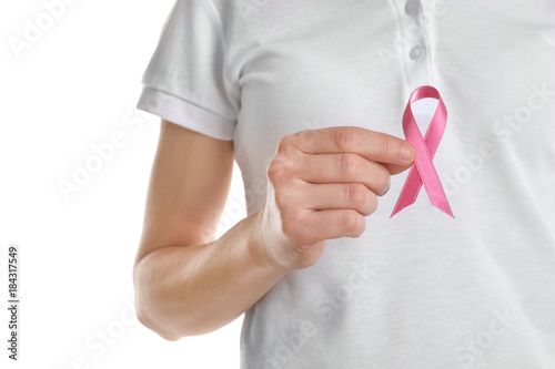 Woman holding pink ribbon on white background. Breast cancer awareness concept