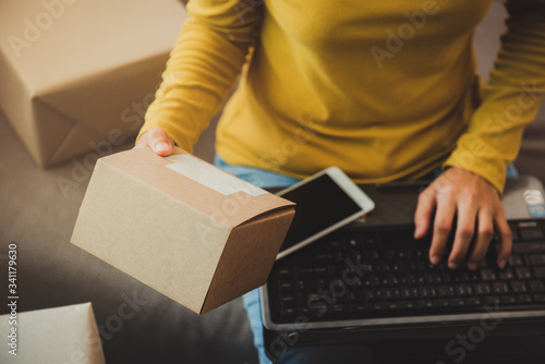 Woman holds a box to prepare to deliver to the customer according to the order at home.Work from home and marketing online or startup small business concept.with copy space.