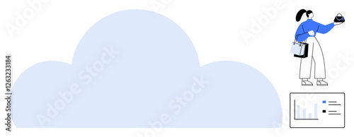 Woman holds smart device and uses cloud technology carrying briefcase, standing beside data chart. Ideal for tech innovation, business solutions, data storage, remote work, connectivity, smart