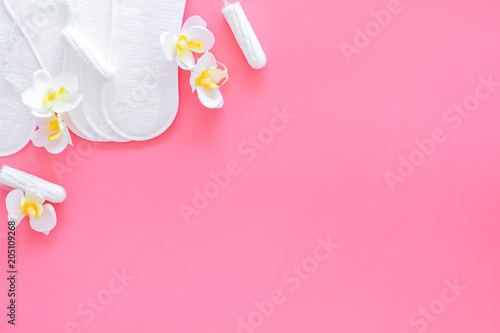 Woman hygiene protection. Cotton tampons and sanitary pads on pink background top view copy space
