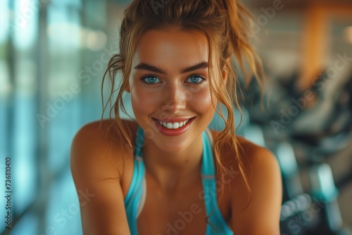 woman, fitness, physical, activity, dancing, bikini, smiling, aerobic, gym, exercise, wellness, joy, young, caucasian, blue, health, active, body, swimwear, beachwear, confident, cheerful, happiness, recreation, sporty, attractive, beauty, portrait, positive, healthy lifestyle, fit, physical exercise, energetic, fun