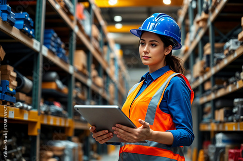 woman, warehouse, hard hat, tablet, technology, work, safety, construction, storage, industrial, digital, device, communication, modern, equipment, engineer, men at work, female, helmet, online, browsing, inspecting, innovative, checking, inventory, management, logistic, scanning, datum, connectivity, supervising, professional, tied-up, active, inspection, adult, caucasian, young, 30s, using, leading, confident, project, standing, expertise