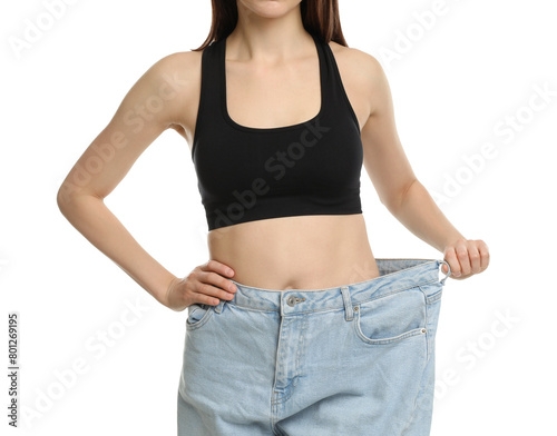Woman in big jeans showing her slim body on white background, closeup