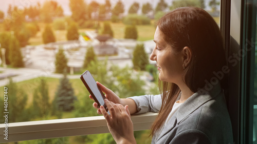 woman, female, window, young, home, person, apartment, happy, house, room, view, people, portrait, smile, hotel, looking, morning, open, alone, business, light, city, lifestyle, caucasian, day, relaxation, travel, indoor, lady, adult, building, communication, phone, smartphone, technology, freedom, life, comfort, standing, fashion, happiness, independent, hand, balcony, cyberspace, message, using, mobile