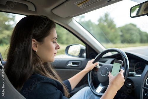 Woman in car driver's seat holding cellphone, glancing at screen, and gripping steering wheel, capturing distracted driving concept