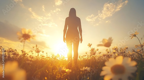 woman, sunset, field, flower, nature, outdoors, silhouette, sunlight, calm, peaceful, beauty, sunrise, spring, summer, walk, hope, freedom, happy, girl, horizon, meadow, daisy, grass, gold, light, serenity, tranquil, enjoyment, inspiration, motivation, positive, healing, relaxation, moment, view, landscape, travel, vacation, photo, image, digital