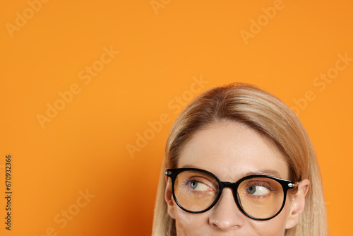 Woman in glasses looking out against orange background, closeup. Space for text